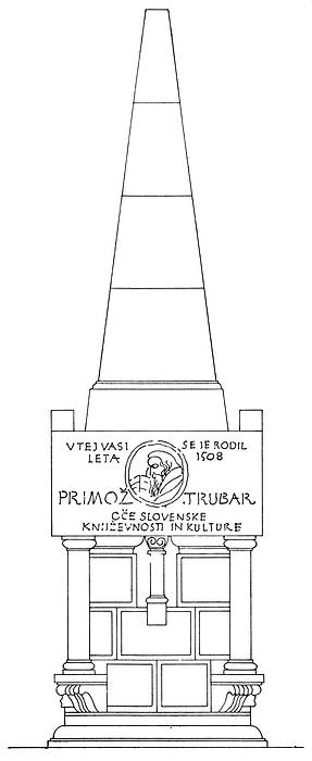 Načrt za spomenik Primožu Trubarju na Raščici (kipar Vinko Glanz, avtor plakete v bronu Vlado Štoviček) /iz Trubarjevega zbornika, 1951