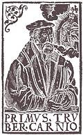 Pred nami je kiparski portret Trubarja v nadnaravni velikosti. Za upodobitev je Tine Kos uporabil najbolj razširjeno predlogo, portret Jakoba Lederleina iz leta 1578.
